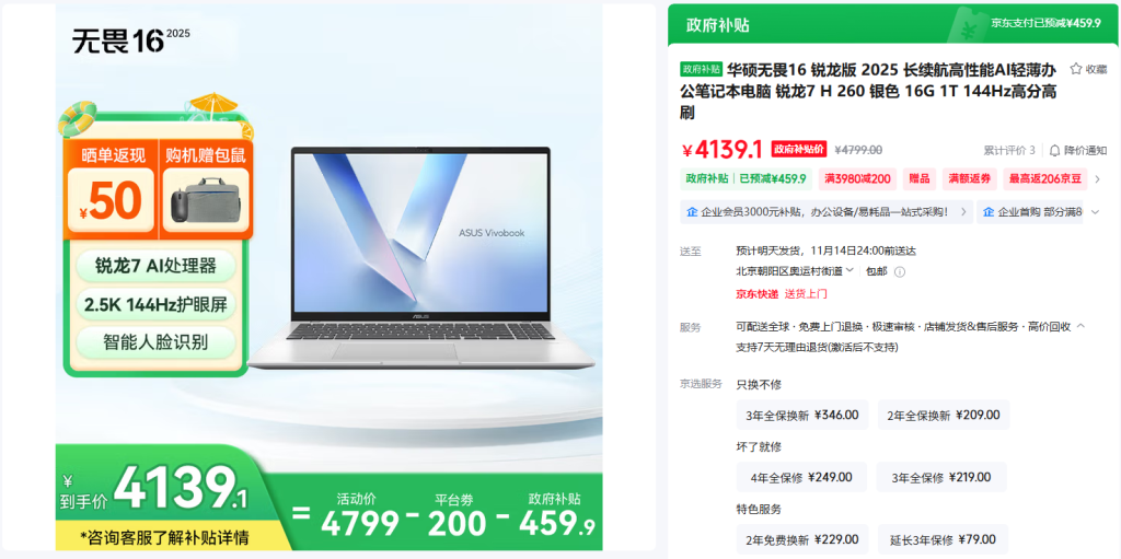 每年双11购物节都是全年消费热度的高峰,对有购机需求的用户而言,此时不仅全年主流新款笔记本已悉数登场,价格也恰好降至一年中最具性价比的区间。因此,若已有心仪机型,趁 2025 年双11巅峰日电商大促的收官冲刺阶段,叠加国补、政补等多重优惠补贴,此刻入手锐龙笔记本,无疑是“芯更强 价更香”的最佳时机!