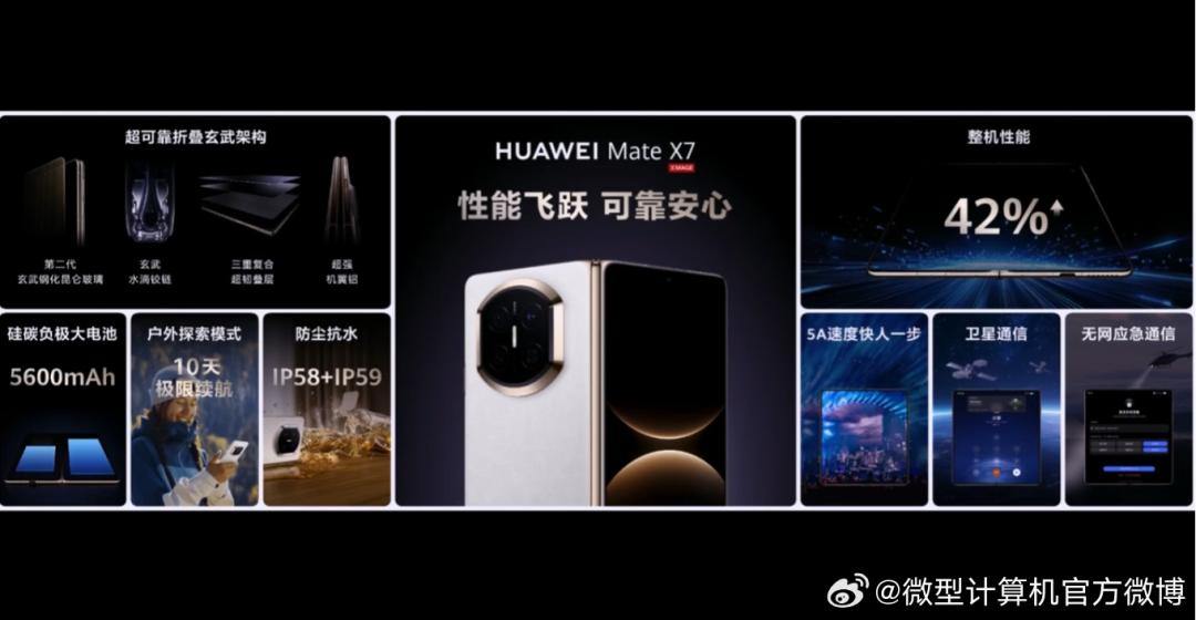 全新折叠屏旗舰HUAWEI Mate X7搭载HarmonyOS 6,软硬协同实现整机性能提升42%。同时28根分布式天线,智能天线调度,实现5A速度,快人一步。可靠安心,不止一面,HUAWEI Mate X7搭载超可靠折叠玄武架构,五大升级协同,构筑超强防护,兼得轻薄机身与可靠耐用。