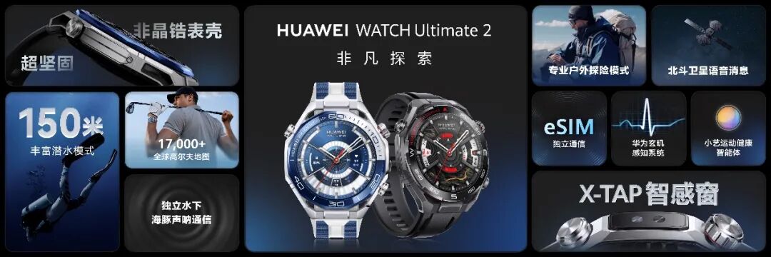 作为非凡探索系列的第二代产品,HUAWEI WATCH Ultimate 2 非凡探索迎来重大升级,采用创新防水系统实现150米潜水级防水,并首发海豚声呐通信技术,实现水下双向通信与水下SOS求救。相较上一代支持的文字消息,本代首次支持北斗卫星语音消息,实现单次发送最长10秒的语音消息,户外无网络极限环境下也能及时求助。此外,基于鸿蒙操作系统 6,它还支持腕上智能体,实现对运动与健康数据的快速解读;并搭载全新X-TAP智感窗,支持eSIM先锋通信,满足高端用户对运动健康与智慧生活的更高追求。