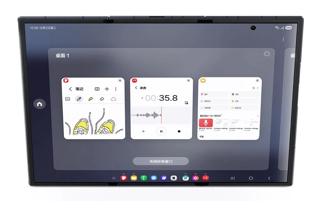 以往需要外联显示设备才能使用的Samsung DeX,现在三星Galaxy Z TriFold可直接在本地独立运行。与此前不同,开启DeX模式后,用户可以创建至多四个独立桌面,每个桌面可同时运行五个应用程序,用户在不同的场景中可以快速切换桌面让效率实现提升。如果需要两块大屏的协同操作,用户也可连接外部显示设备,用扩展模式实现PC般的高效交互。