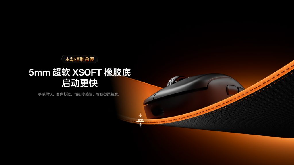 全系配置5mm 超 Xsoft 软橡胶底。八字纹理设计,软弹度均匀统一,摩擦抓力牢固,轻松应对木质、金属、玻璃等各类桌面。疾速甩枪、下压按停等激烈操作下,依旧能牢牢贴合桌面,零位移、零晃动,保障操控稳定性。“软则易滑、稳则过硬” 的传统鼠标垫矛盾将不复存在。