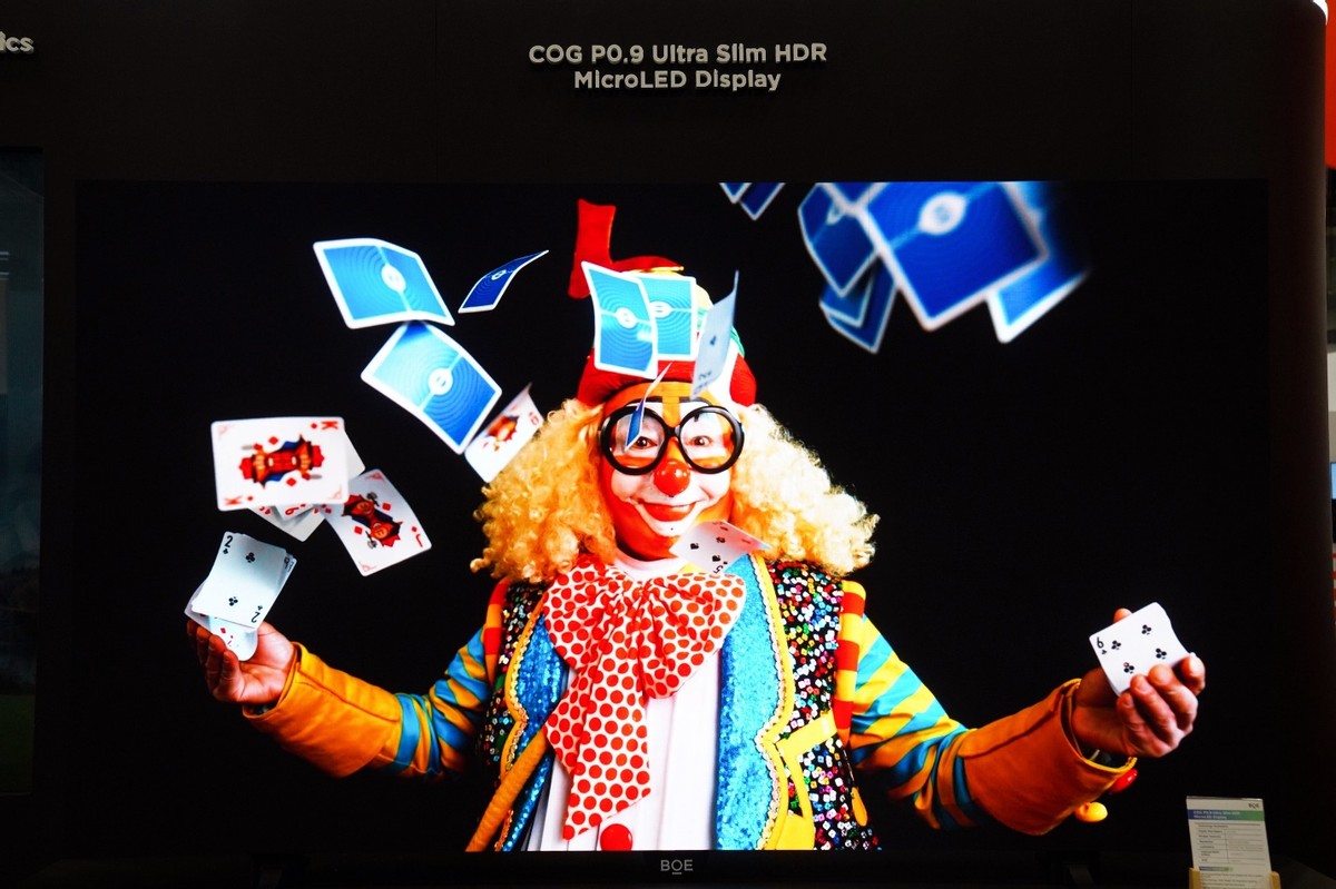 在α-MLED 领域,BOE(京东方)凭借自研高 PPI 巨量转移工艺、低功耗背板技术和高亮度光学微结构等核心优势,进一步拓展在绿色车载显示中的应用空间。其中,首款 COG玻璃基P0.9超薄HDR Micro LED一体机在 CES 现场首次亮相,产品依托玻璃基技术优势,拥有超高清、高亮度、超薄超平、护眼无闪、无缝拼接的特点,10lux环境光下达到ACR对比度≥20000:1,暗态表现出众;旗舰产品 BYH Ultra P0.9,达到20000:1 的超高对比度和 7680Hz 高刷新率;此外,现场还重磅展出了适用于智能座舱系统的30万nits 玻璃基Micro LED PHUD显示和Micro LED全彩木纹隐藏显示展品,具备超高亮度与像素密度,在强光环境下仍清晰可见。