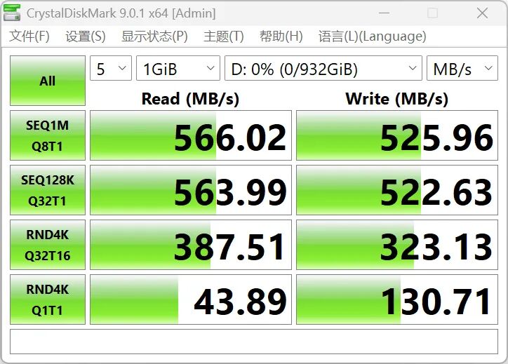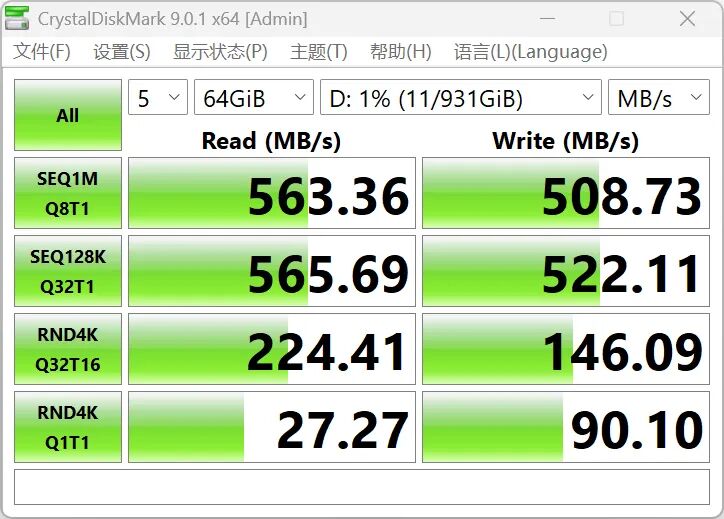 由于在全默认设置测试中,这两款测试软件只会使用1GB容量的数据进行测试。因此我们还在基准软件可设置的最大容量下对致态小翼S001固态硬盘1TB进行了测试,其中在AS SSD Benchmark中测试容量为10GB,在CrystalDiskMark中,测试容量为64GB。结果显示,读写大容量文件时,这款产品的CrystalDiskMark的顺序读写速度没有太大变化,仍能分别达到565.69MB/s、522.11MB/s,仅随机读写速度出现较明显的下降。在AS SSD Benchmark测试中也有类似的结果,大部分测试成绩出现小幅下降,仅随机4K-64Thrd写入性能下降较明显,因此它的测试成绩仍有817分,相对1GB容量测试下的成绩仅下降10%。