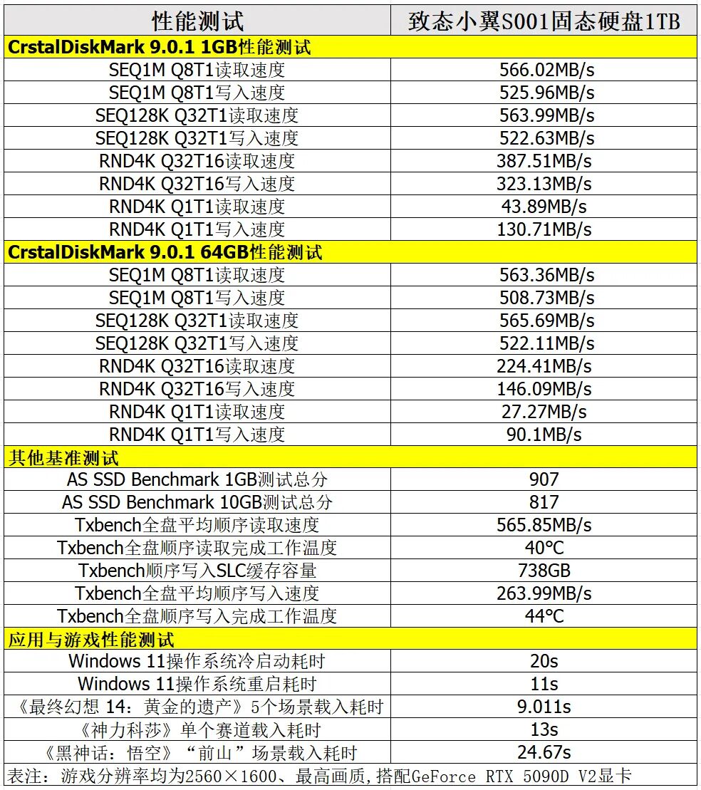 致态小翼S001 1TB在2560×1600分辨率、影视级画质下载入《黑神话:悟空》的耗时只比高性能PCIe 4.0产品多4s。