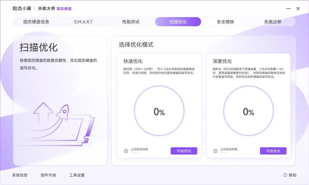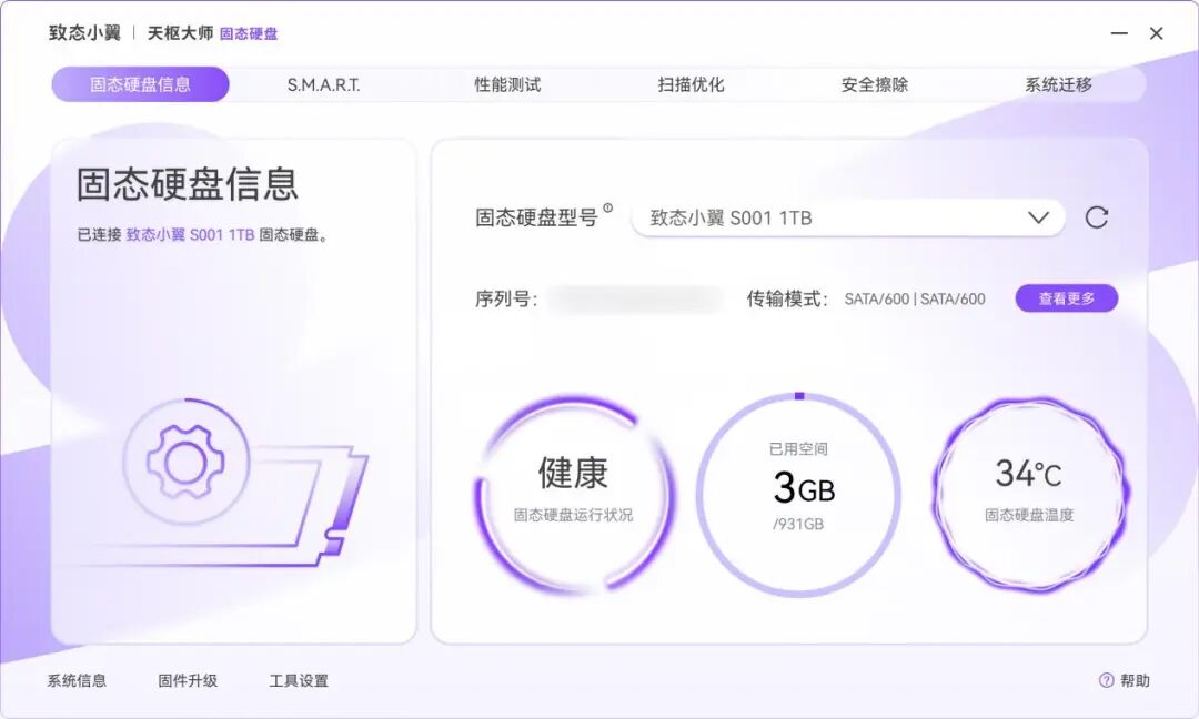 同样,致态小翼S001固态硬盘的用户也可以下载、安装免费的天枢大师工具软件对固态硬盘进行维护。该软件的设计界面与产品包装类似,也是以紫色羽翼为背景,给人轻松、活泼的观感。该软件不仅可以清晰地显示固态硬盘的健康状态、可用空间与工作温度,让用户对固态硬盘的工作状态了如指掌。天枢大师还能对固态硬盘的固件进行升级,并拥有将固态硬盘性能恢复到出厂状态的安全擦除功能。该功能对用户来说非常实用,很多固态硬盘需要用户自制USB启动盘才能执行安全擦除功能,相当麻烦。而天枢大师的安全擦除功能可在Windows操作系统下运行,用户只需通过简单地点击按钮,就能让固态硬盘在最佳性能状态下工作,非常方便。