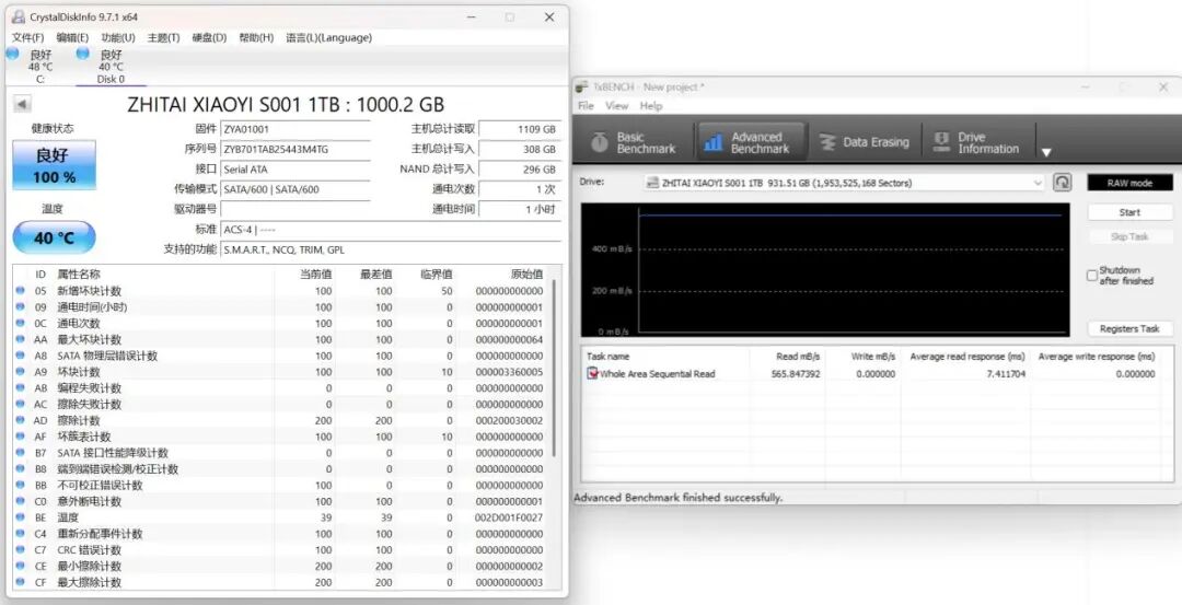 致态小翼S001固态硬盘1TB的全盘读取速度高达565.85MB/s,完成1TB数据写入后的温度仅40℃。