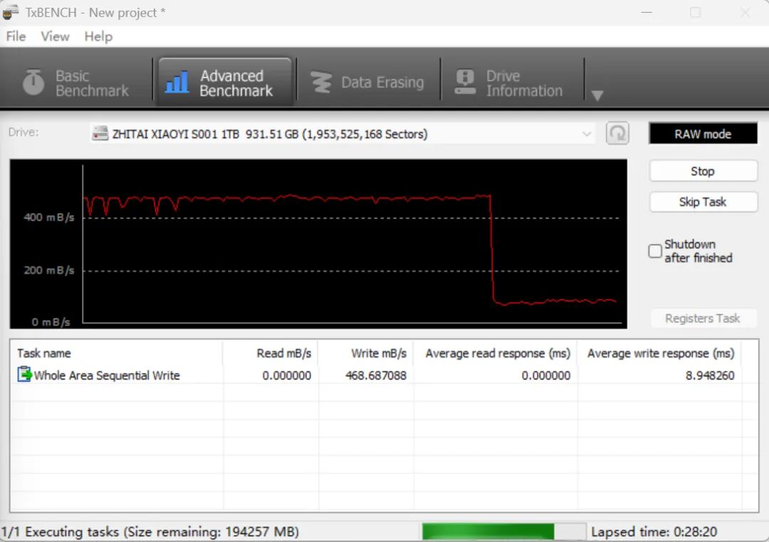 同时为了考察固态硬盘在读写更大容量数据时的性能与温度表现,我们还使用Txbench进行了全盘读写测试。首先在整个读取过程中,它没有出现掉速现象,平均顺序读取速度更高达565.85MB/s,也超过了标称的550MB/s读取速度。更值得注意的是,在读取1TB数据后,SSD的工作温度仅40℃。全盘写入测试则显示,致态小翼S001固态硬盘1TB拥有一个容量颇大的SLC缓存,约738GB。当写入的数据量低于这个容量时,SSD的顺序写入速度就能达到460MB/s~534MB/s,超过这个容量后SSD才会出现明显掉速。由于绝大部分用户一次写入SSD的数据量不会超过100GB,因此这个大容量SLC缓存完全能够满足普通用户的使用需求。