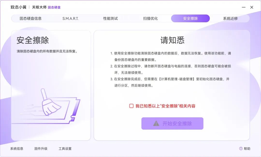 天枢大师内置的安全擦除工具可一键将固态硬盘的性能恢复到出厂状态,但需清除掉盘内所有数据。