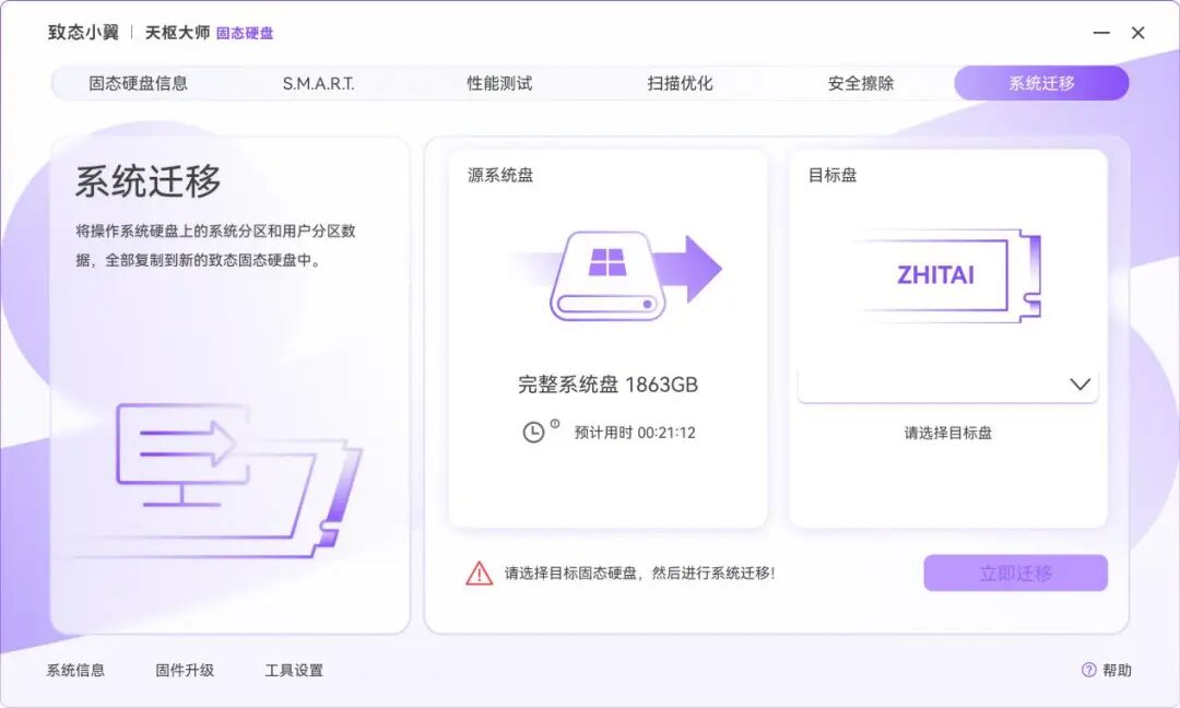 天枢大师中非常实用的系统迁移功能,可一键将已经安装的操作系统转移到新的致态小翼固态硬盘中。