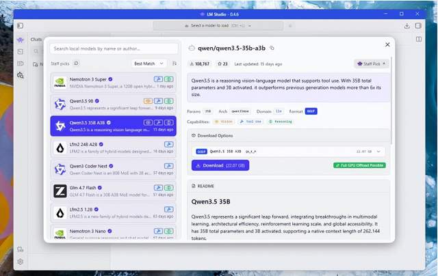 - 在左侧选择 “Qwen 3.5 35B A3B”,然后在右侧点击下载,等待下载完成。