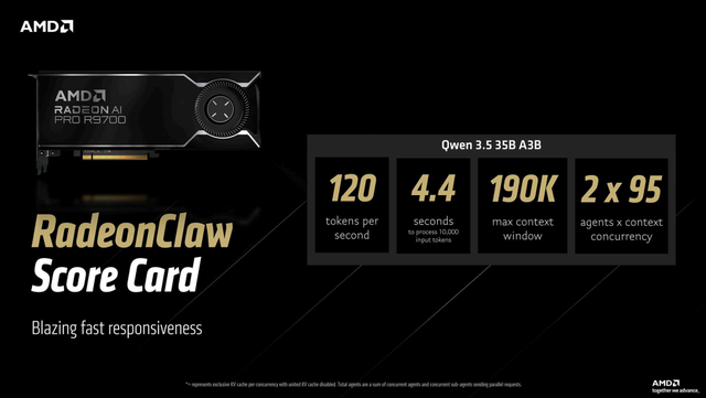 RadeonClaw评分卡展示了在AMD Radeon AI PRO R9700显卡上运行相同工作负载时所带来的性能提升。在运行Qwen 3.5 35B A3B 模型时,系统可实现约120 tokens/s 的生成速度,处理10,000个输入token仅需约4.4秒。该配置支持19万token的上下文窗口,并且最多可同时运行2个智能体。这一结果显著提升了本地智能体推理的响应速度。