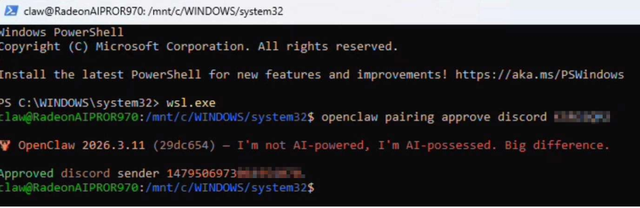 要完成Discord配对,只需向你的机器人发送私信,它就会回复一个配对代码以及在已激活WSL的PowerShell 窗口中粘贴的完整命令: