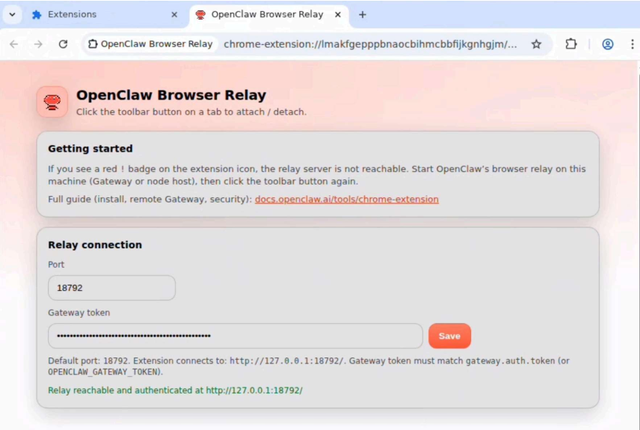 随后会出现一个页面,要求输入Token。请输入该Token 并点击 Save(保存)。如果配置成功,页面会显示 “Relay reachable and authenticated(中继已连接并完成认证)“。