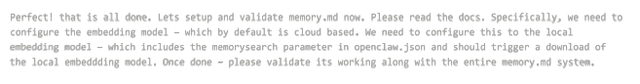 Perfect! that is all done. Lets setup and validate memory.md now. Please read the docs. Specifically, we need to configure the embedding model – which by default is cloud based. We need to configure this to the local embedding model – which includes the memorysearch parameter in openclaw.json and should trigger a download of the local embeddding model. Once done – please validate its working along with the entire memory.md system.