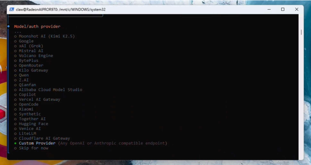 按向下箭头键滚动至“Custom Provider自定义提供商”,然后按回车键确认。