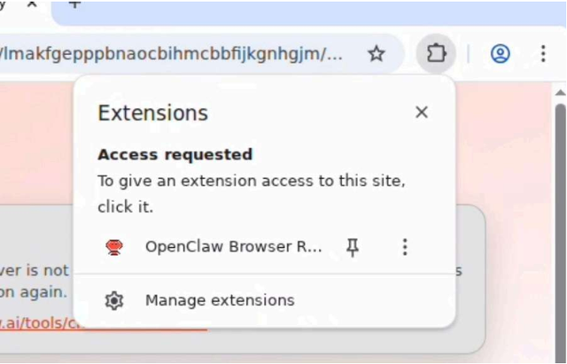 点击工具栏中的扩展程序图标(拼图形状),然后点击 OpenClaw Browser Relay 将其开启。开启后,您将看到提示信息:“OpenClaw Browser Relay started debugging this browser(OpenClaw Browser Relay 已开始调试该浏览器)。“
