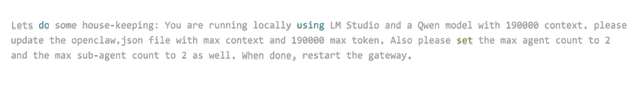 Lets do some house-keeping: :You are running locally using LM Studio and a Qwen model with 190000 context. please update the openclaw.json file with max context and 190000 max token . Also please set the max agent count to 2 and the max sub-agent count to 2 as well. When done, restart the geteway.