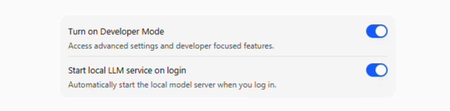 - 勾选”Developer Mode(开发者模式)”和”Start LLM service login(登录时启动LLM服务)”。