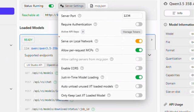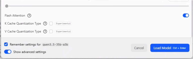 - 点击Load Model(加载模型),选择Qwen 35B A3B。此前配置的设置应会自动填充,然后点击 “Load(加载)”。