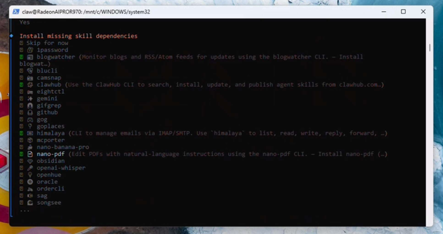 现在我们将选择一些初始功能:himalaya、blogwatcher、nanopdf和clawhub(如果在列表中找不到clawhub也别担心——可以稍后再配置)。如果系统提示,请选择npm并继续安装。
