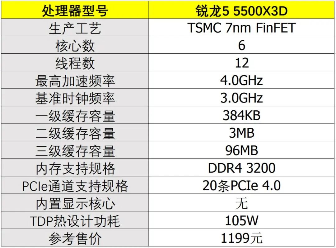 如果你正在使用DDR4内存、基于AM4接口的AMD 300系、400系或500系芯片组主板,并想进一步提升电脑的游戏性能,那么锐龙5 5500X3D处理器就是不错的选择。它是AMD为AM4老平台推出的最新产品——基于TSMC 7nm工艺、Zen 3架构,采用6核12线程设计。其基准时钟频率为3.0GHz,最大加速频率达4.0GHz,官方TDP为 105W。这款产品的核心优势在于通过堆叠64MB 3D缓存,其L3缓存总容量达到96MB,令它拥有突出的游戏性能。同时,由于它采用Zen 3架构,因此这款处理器只能使用DDR4内存,用户为它搭配价格低廉的DDR4 3200内存即可,使用成本比以上处理器都低。