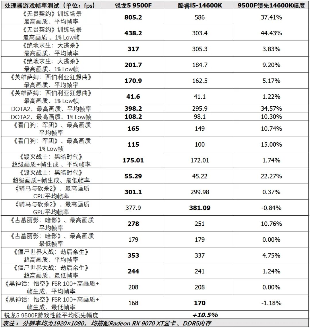 游戏性能方面,在搭配Radeon RX 9070XT显卡、DDR5内存的1080p分辨率下,锐龙5 9500F在《无畏契约》训练场景中的平均帧率高达805.2 fps,而酷睿i5-14600K的平均帧率仅586fps。《绝地求生:大逃杀》中,尽管锐龙5 9500F的平均帧率领先幅度在5%以内,但其1% Low帧的领先幅度高达9.2%。更高的1% Low帧意味着游戏过程中帧生成时间更稳定,能有效减少卡顿,这对竞技类FPS玩家尤为重要。《毁灭战士:黑暗时代》中也有类似的情况,虽然锐龙5 9500F、酷睿i5-14600K的平均帧率接近,但锐龙5 9500F的最低帧率快了22.27%。除了以上游戏,锐龙5 9500F还在DOTA2、《看门狗:军团》《僵尸世界大战:劫后余生》等游戏中有明显优势,其游戏性能平均领先酷睿i5-14600K达10.5%。如果你准备组装一台不需要集显的高性价比独显游戏电脑,锐龙5 9500F就是更好的选择。