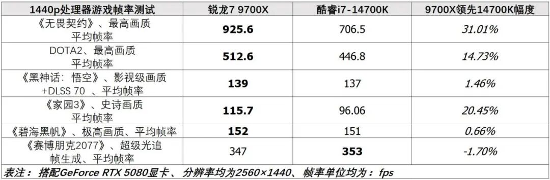 在搭配GeForce RTX 5080显卡、2560×1440分辨率下,锐龙7 9700X运行《无畏契约》训练场景时的平均帧率高达925.6fps,在部分场景中的帧率甚至能达到1100fps以上。而酷睿i7-14700K的平均帧率只有706.5fps,锐龙7 9700X的平均帧率快了多达31%,领先幅度很大。在DOTA2中,锐龙7 9700X与GeForce RTX 5080组合在训练场景下的平均帧率可以突破500fps,而酷睿i7-14700K的平均帧率不到450fps,前者也有14.7%的领先幅度。