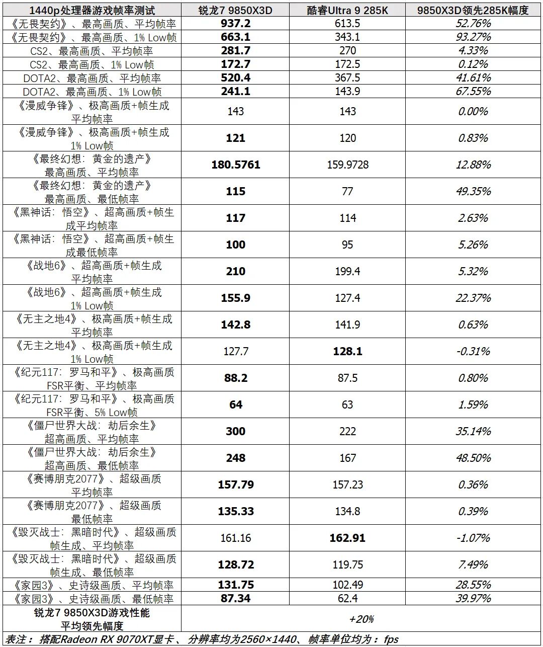 而在《僵尸世界大战:劫后余生》《家园3》的平均帧率、最低帧率测试中,锐龙7 9850X3D也以较大的优势击败酷睿Ultra 9 285K,最低领先幅度也有28.55%。2560×1440分辨率下的26个项目测试里,锐龙7 9850X3D赢了23个,其游戏性能平均领先酷睿Ultra 9 285K达20%。可以说它的游戏性能相对于竞争对手优势巨大。酷睿Ultra 9 285K仅在《无主之地4》《毁灭战士:黑暗时代》与对手平分秋色。两款产品的《无主之地4》测试成绩差距很小,不到1%。而在《毁灭战士:黑暗时代》测试中,锐龙7 9850X3D的平均帧率比酷睿Ultra 9 285K慢了1.07%,但其最低帧率却领先后者达7.49%。