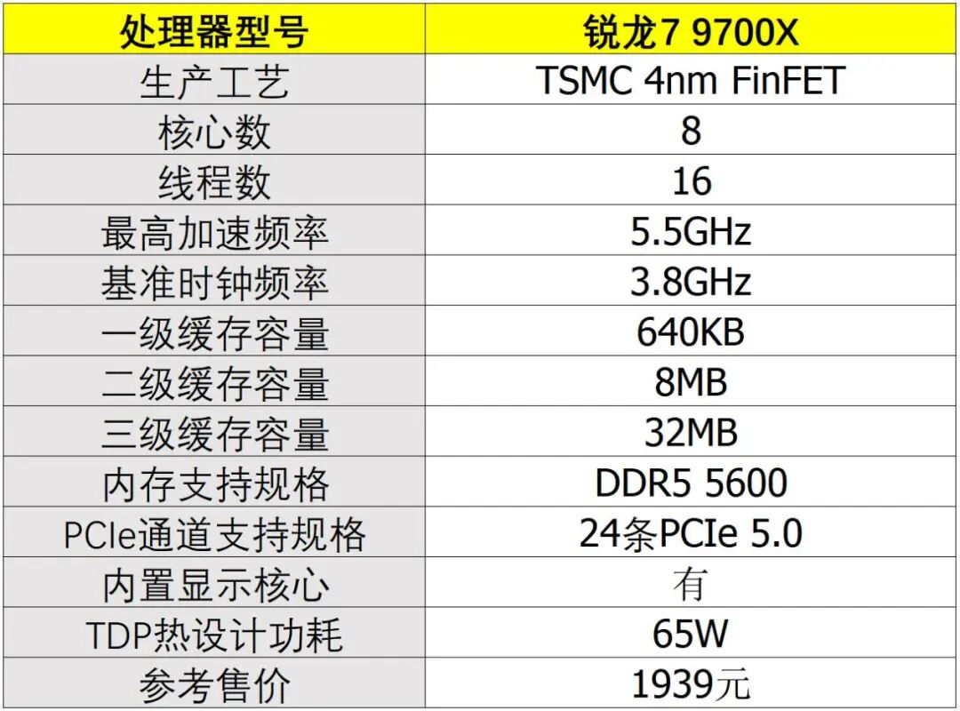 ▲锐龙7 9700X采用8核心、16线程配置,最高加速频率达到5.5GHz,但借助先进生产工艺,TDP只有65W。
