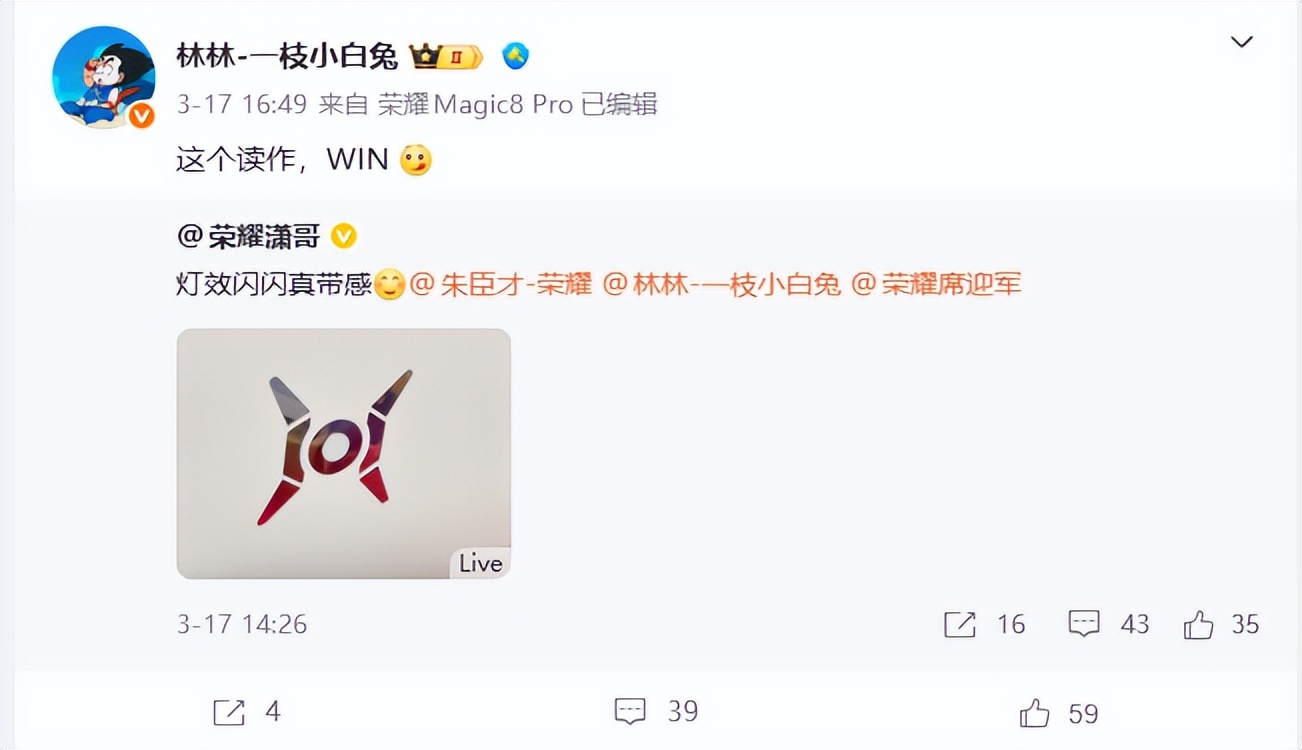 今年3月以来,多方信源证实荣耀WIN游戏本即将到来,目标冲击高端性能旗舰市场。3 月 17 日,@荣耀潇哥 晒出游戏本的局部灯效,荣耀中国区智慧生活业务部部长林林转发了该微博,表示该产品即为荣耀WIN游戏本。