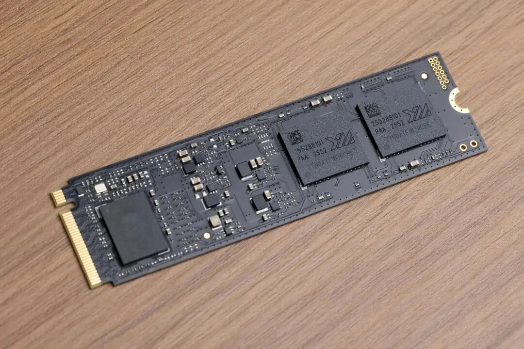 揭下固态硬盘的标签,可以看到,本次测试的致态TiPlus9100 PCIe 5.0固态硬盘2TB主要由3颗芯片组成——1颗PCIe 5.0 4通道DRAMLESS主控、2颗闪存芯片。其PCB上没有内存颗粒,证明这是一款DRAMLESS无独立缓存PCIe 5.0固态硬盘。相比8通道主控,4通道主控可以有效降低SSD的功耗、发热量与成本。同时,DRAMLESS无独立缓存的技术特性还意味着,无须配备内存颗粒,固态硬盘将通过HMB主机高速缓冲技术,占用少量系统内存作缓存,临时保存已从闪存读取的数据、要写入闪存的数据,以及地址映射表,从而有效提升SSD的I/O性能。