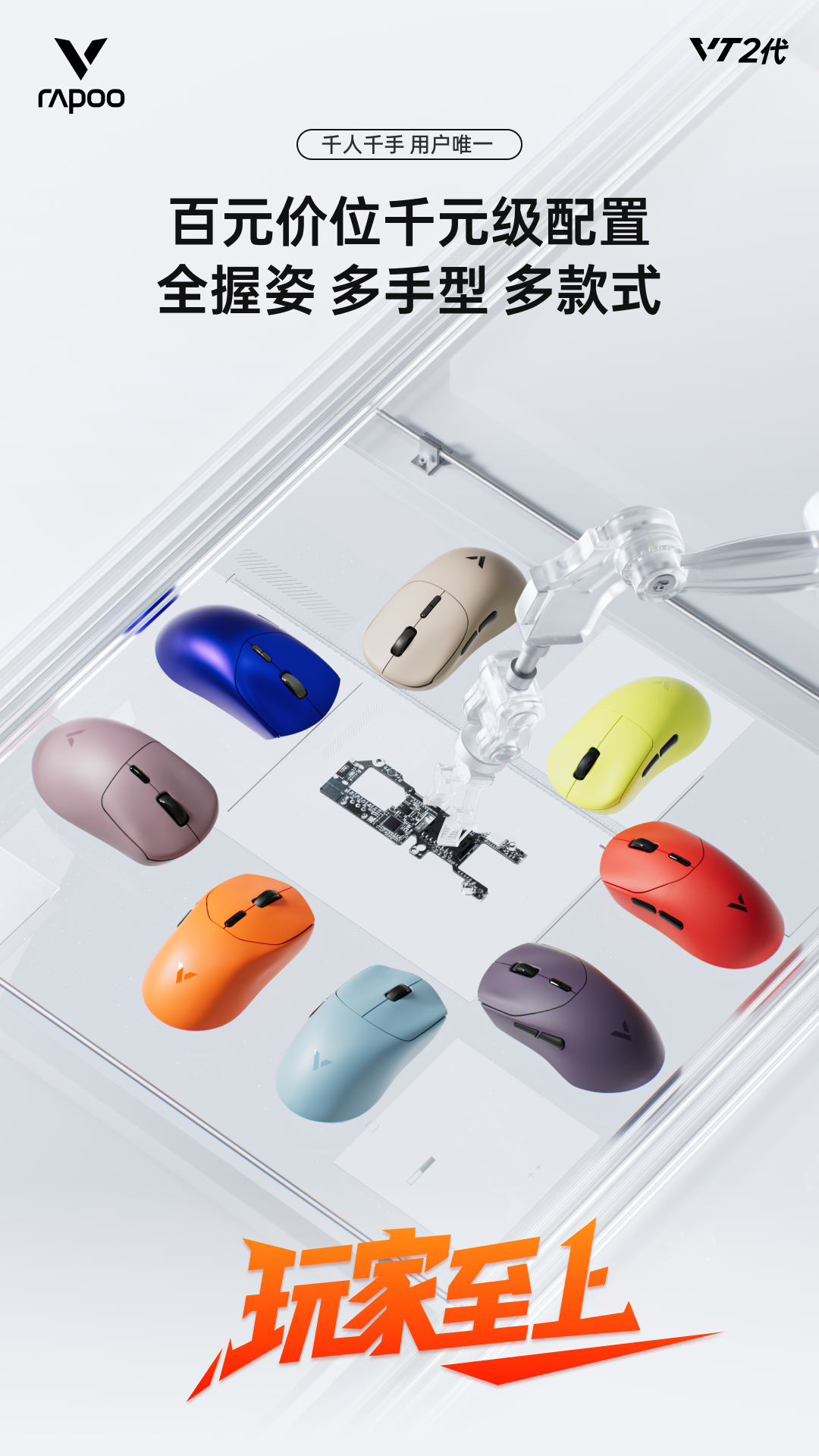 这是一个足以改写行业选购逻辑的产品策略。在此之前,电竞鼠标市场长期存在一个无解的矛盾:玩家想要旗舰级的无线性能和传感器精度,往往只能接受厂商指定的一两款主流模具;而真正贴合自己手型握法的产品,又大多被归为入门线,核心性能被大幅阉割。雷柏 VT 二代彻底推翻了这一规则:所有模具共享同一套旗舰级底层架构,性能与续航作为基础常量已被全系拉齐,唯一的变量仅剩手型大小和握姿的适配。