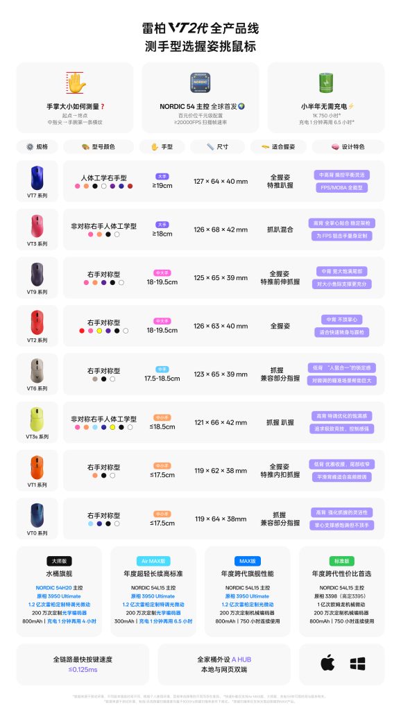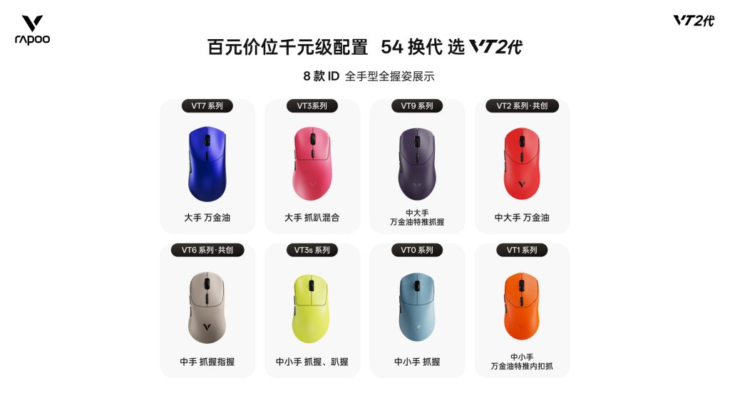 本文将从手型握法、性能体验、性价比、跟手性等各个维度,帮助用户基于自身使用习惯做出最优决策。目前雷柏VT二代系列八款鼠标——VT3、VT7、VT3s、VT1、VT2、VT0、VT9以及最新的VT6。