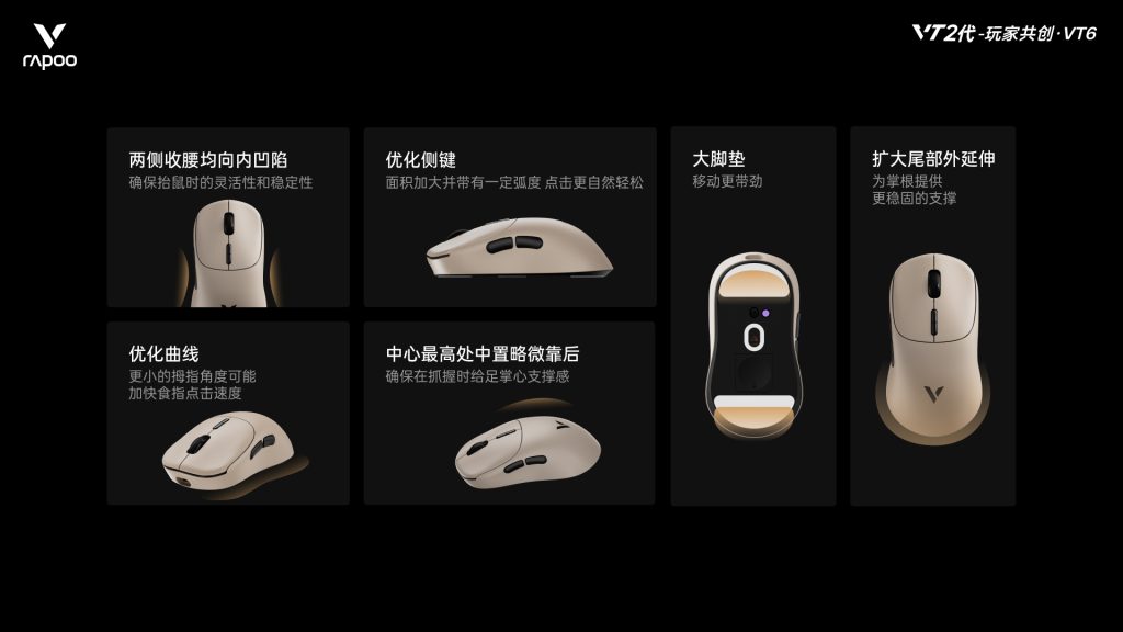 VT6是第二期玩家共创,尾部宽至65mm,收腰非常窄,最窄处约53mm,背部最高点(39mm)相对后置,为类U2模具。抓握时拇指和无名指捏合力更集中,跟枪微调时鼠标操控感和掌控感极佳。侧键加大并凸起,盲操不易误触。